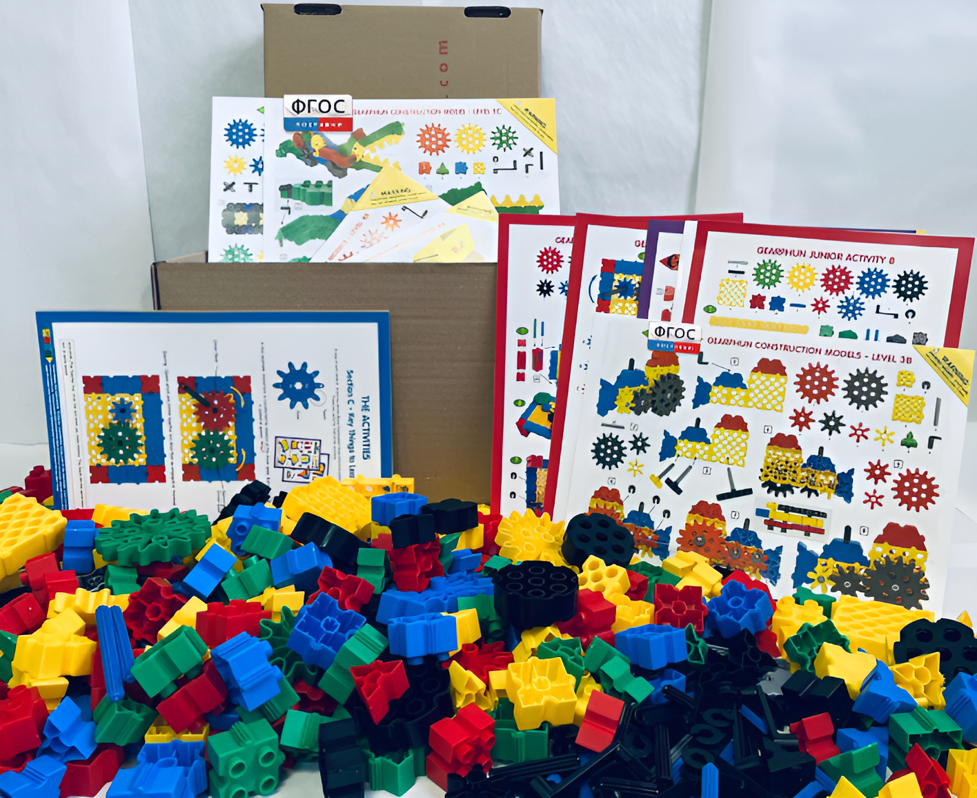 Конструктор состоит из 480 пластмассовых деталей: квадраты, треугольники, колеса,  шестеренки разных размеров (не менее  5-ти) соединительные и направляющие элементы. В составе 10 пошаговых инструкций и 34 рабочие карточки.