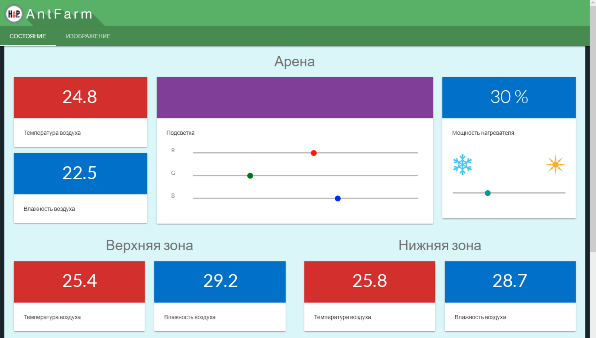Управление всеми режимами работы и мониторинг за показаниями осуществляются через Web-интерфейс, доступный при беспроводном Wi-Fi подключении микрокомпьютера к локальной сети.
