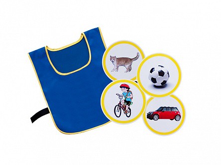 Игровой набор представляет собой комплект из ярких сине-желтых жилетов, надевающихся через голову, и круглых цветных тематических картинок.