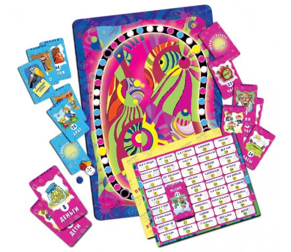 В игре: Игровое поле, 96 карточек со словами и иллюстрациями, проверочные таблицы, фишки с кубиком