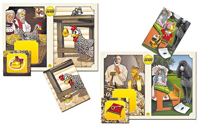 Игра состоит из 12 полноцветных игровых полей формата А5, 12 квадратных и 12 прямоугольных полноцветных карточек. Карточки и игровые поля изготовлены из картона и ламинированы пленкой. Каждое игровое поле посвящено одной из известных сказок. На карточках изображены персонажи и предметы, которые встречаются в этих сказках и оказывают значительное влияние на ход событий в них. Карточки служат продолжением изображений на игровых полях и содержат общие с ними детали фона.