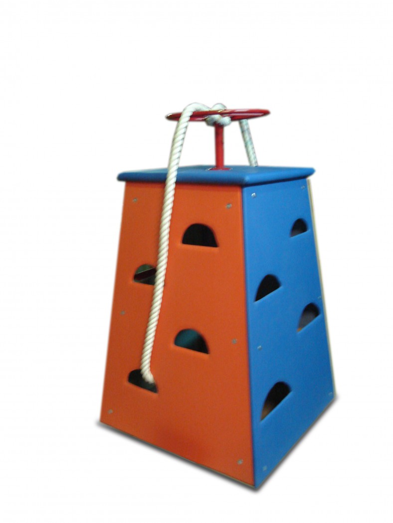 Башня изготовлена из листов фанеры толщиной 15мм, обтянутых искуственной кожей с подкладкой из ППЭ 10мм. Башня имеет вырезы для ножек, расположенных на разной высоте и канат, для того чтобы во время восхождения можно было держаться.