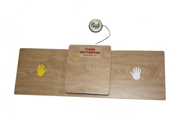 Станок счетчик устанавливается на ровную поверхность пола. Сдающий норматив по отжиманию принимает положение -  упор лежа с опорой левой руки на левый, а правой руки на правый край станка. При касание контактной платформы, расположенной по центру станка грудью зажигается сигнальный светодиод. Таким образом и судья и участник видят касание контактной платформы. Таким образом осуществляется контроль фазы сгибания рук при отжимание. Разгибание рук контролируется судьей визуально. При этом судья голосом ведет счет количества отжиманий.