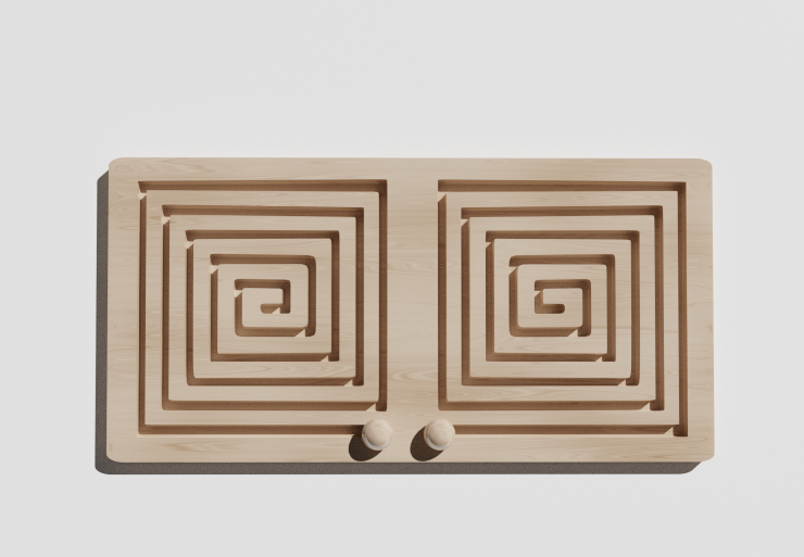 Малышу необходимо взять два бегунка и установить в лабиринте. Сначала двигать кружок по маршруту правой, затем только левой рукой, а после двигаться по траектории лабиринта обоими руками одновременно по часовой стрелке, а потом против. Упражнение помогает сформировать одновременную работу рук, глаз и обоих полушарий.