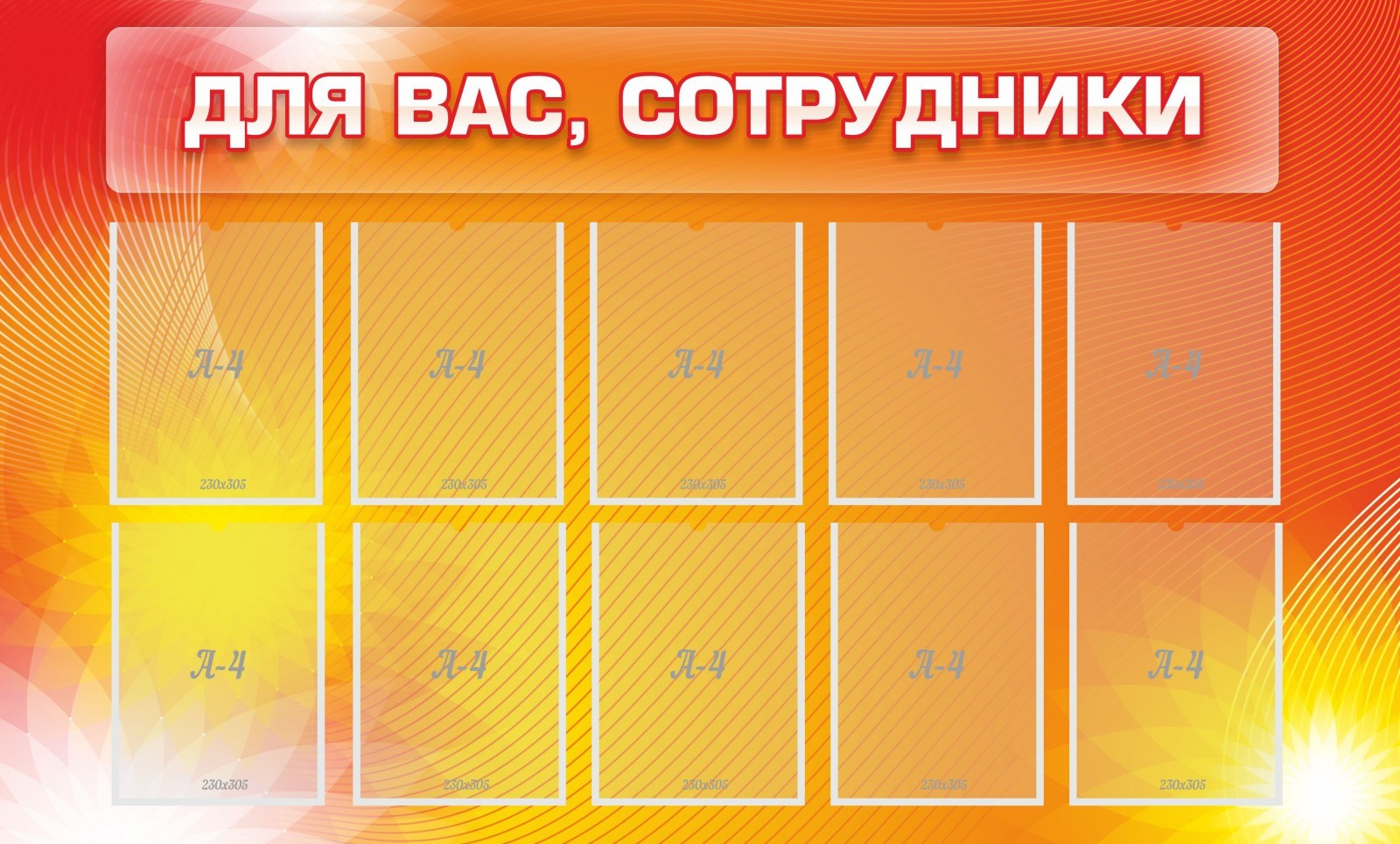 Такой красочный желто-оранжевый стенд имеет довольно много функций. На нем можно повесить информацию об учебно-методическом процессе, о предстоящих мероприятиях, о планах работы и о многом другом. Для размещения объявлений или документов на стенде имеются 10 карманов формата А4, которые покрыты качественной ламинирующей пленкой и имеют наклонный надрез сверху. Данная модель стенда будет красиво смотреться как в холле, так и в коридоре или в учительском кабинете. Пластиковый лист ПВХ, из которого сделан этот стенд, очень легкий, поэтому с транспортировкой стенда или с его установкой не возникнет проблем.