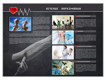 Стенд представляет собой панель, на которой размещена информация о методах, применяемых для лечения наркотической зависимости.