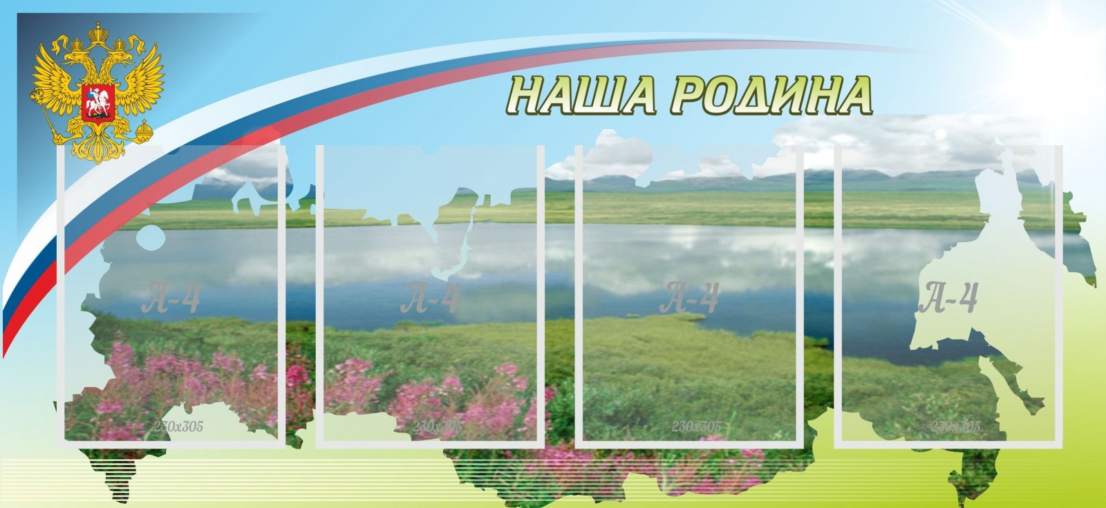 Небольшой, но очень красочный горизонтальный стенд «наша родина» выполнен с помощью качественной фотопечати. Стенд представляет собой изображение карты России, поверх которого размещены 4 кармана для листов А4. На таком стенде уже имеется герб страны и красивая дугообразная лента с цветами флага России. В имеющиеся карманы можно поместить любую информацию о стране, политиках, окружающей среде или же, о грядущих мероприятиях школы. Такой стенд привлечет внимание не только учащихся, но и учителей, поэтому любая информация на таком оригинальном стенде не останется без внимания.
