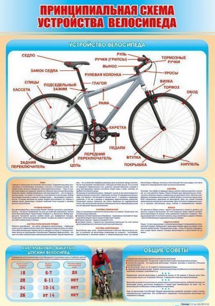 Стенд представляет собой информационную панель, на которой изображена принципиальная схема устройства велосипеда, а также размещены общие советы по эксплуатации велосипеда и сведения о том, как правильно выбирать детский велосипед.