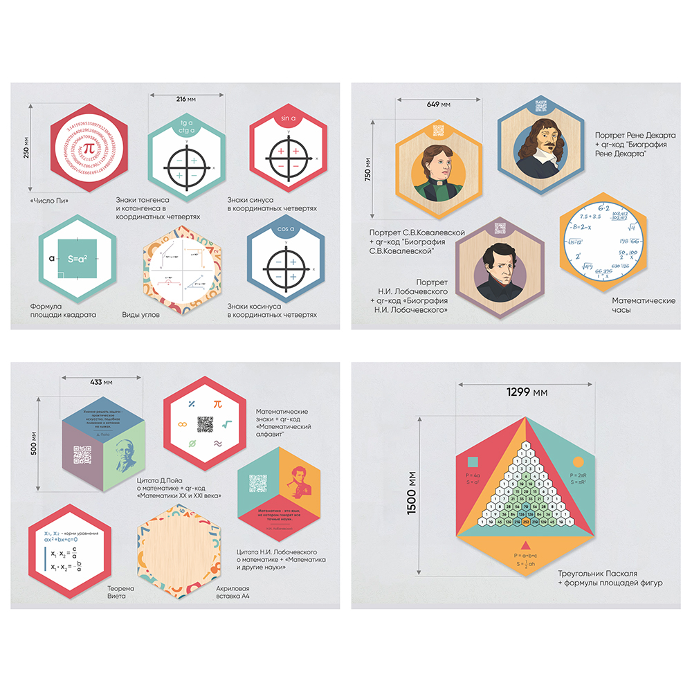 Каждый шестигранник содержит обучающую информацию: портреты выдающихся людей, их достижения и великие цитаты, основные постулаты науки, формулы, графики, теоремы. Благодаря qr-кодам дети могут подробнее узнать об учёных, изображённых на портретах, стоит только навести на них телефон.