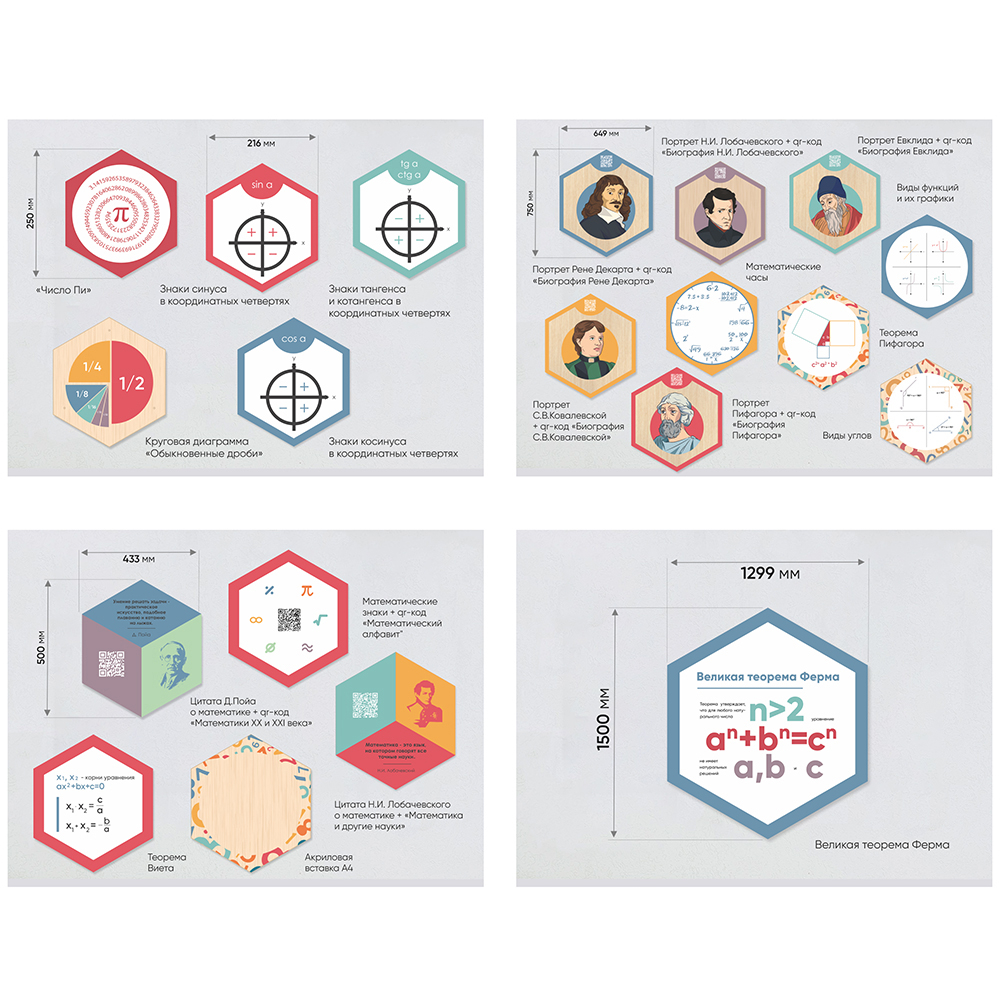 Каждый шестигранник содержит обучающую информацию: портреты выдающихся людей, их достижения и великие цитаты, основные постулаты науки, формулы, графики, теоремы. Благодаря qr-кодам дети могут подробнее узнать об учёных, изображённых на портретах, стоит только навести на них телефон.