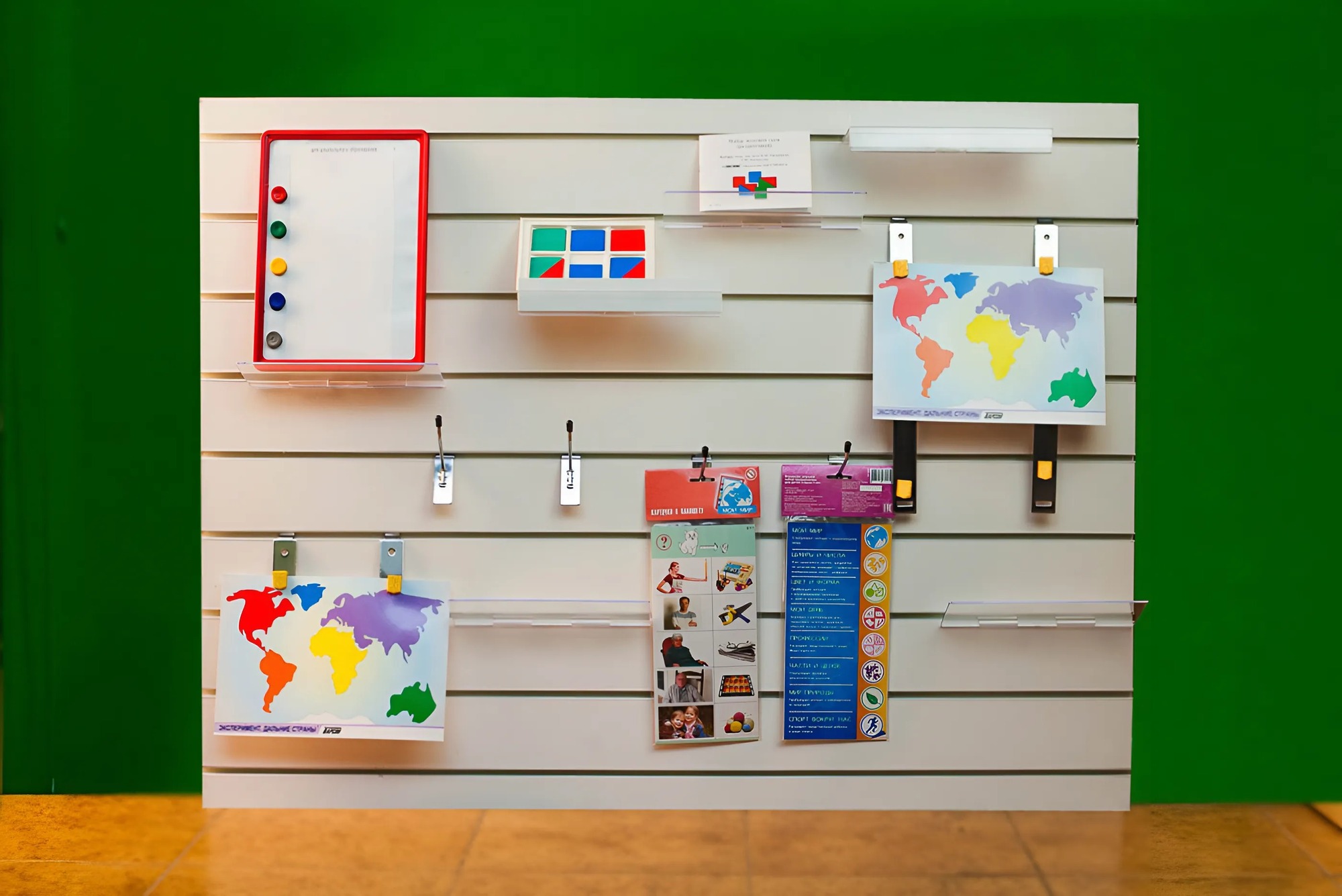 Стенд представляет собой ламинированный щит с пазами для крепления аксессуаров: набора полок, крюков, магнитных держателей и подвесок. Аксессуары вставляются в пазы щита и размещаются на стенде в удобном для экспозиции месте.
