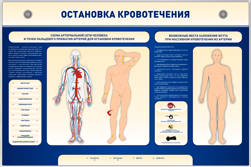 Электрифицированный стенд-тренажер представляет собой информационную панель с комбинированной световой индикацией. На стенде-тренажере изображена артериальная сеть человека с обозначением мест возможного кровотечения вследствие различных травм, точек пережатия артерий для быстрой остановки кровотечения и областей наложения жгутов. В конструкцию учебного оборудования интегрированы высокочувствительные сенсоры для управления стендом при помощи интерактивного магнитного воздействия приемо-передающих устройств во время обучающего процесса и проведения тестовых заданий.