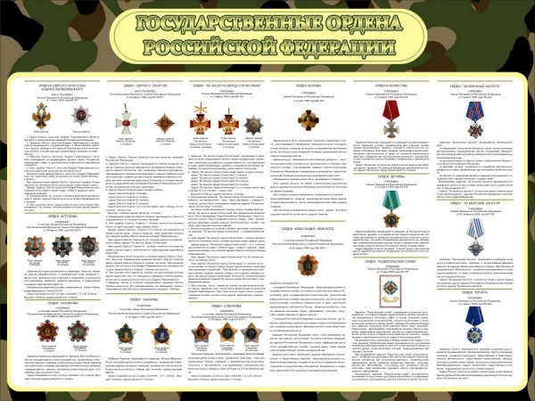 На стенде «Государственные ордена РФ» предоставлены разнообразные ордена и полная информация за какие заслуги они присваиваются, где каждый орден имеет свое название и даже историю своего происхождения. Стенд позволяет ознакомится со всеми известными орденами школьникам учебных заведений и курсантам. Стенд изготовлен из качественного, очень легкого и вполне надежного материала. Основание имеет отличную картинку с орденами в хорошем разрешении, покрытым ламинацией. Для того, чтобы повесить стенд на стену, можно воспользоваться обычным двухсторонним скотчем или небольшими саморезами.