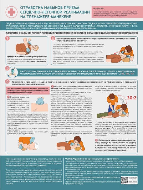 Стенд предназначен для наглядного отображения информации о приемах сердечно-легочной реанимации на тренажере-манекене, а также для формирования у учащихся, курсантов или сотрудников предприятий знаний об оказании первой помощи.