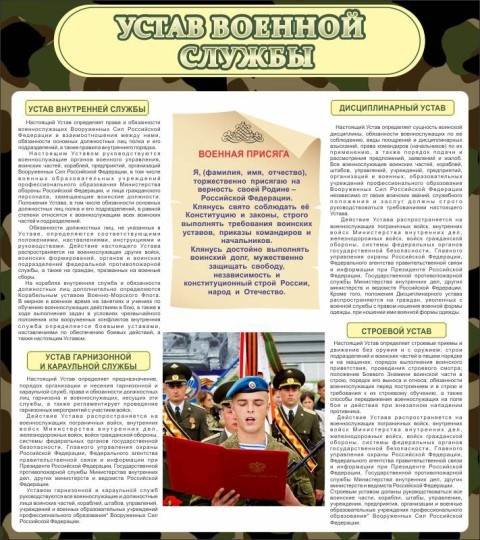 После окончания школы учащийся становится мужчиной, который должен защищать интересы своего государства, родных и близких на срочной службе в рядах армии РФ. Первоначально подготовить к жизненному пути в ряды армии РФ должны образовательные учреждения, донося информацию о присяге, уставе, дисциплине срочной службы с начальных классов. Стенд «Устав военной службы» привлекая внимание, замечательно помогает руководству учебных заведений в воспитании юных солдат. Красочный стенд, оформленный в стиле хаки, имеет полную информацию о всех нюансах военной службы. Благодаря основанию из ПВХ стенд можно использовать его в любом помещении.