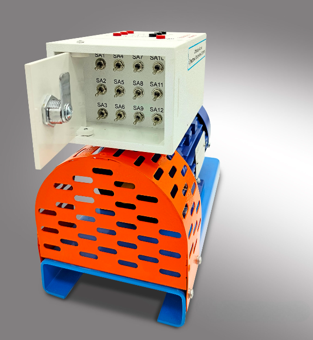 На основании закреплен трехфазный асинхронный двигатель, оснащенный блоком ввода неисправностей, позволяющим ввести 12 различный неисправностей. Ввод неисправностей осуществляется при помощи тумблеров, расположенных за защитной дверцей, оснащенной замком.