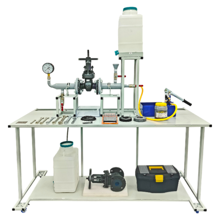 Стенд позволяет на практике изучить конструкцию клиновой задвижки, выполнить демонтаж/монтаж задвижки на участок трубопровода, заполнить трубопровод жидкостью и провести опрессовку для проверки герметичности.