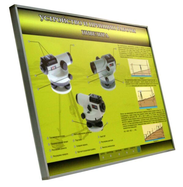 Учебный стенд предназначен для изучения устройства, принципа работы и освоения практических навыков работы с оптическим нивелиром. Используется в учреждениях среднего профессионального и высшего образования при подготовке специалистов по направлениям «Геодезия», «Строительство», «Землеустройство и кадастры».