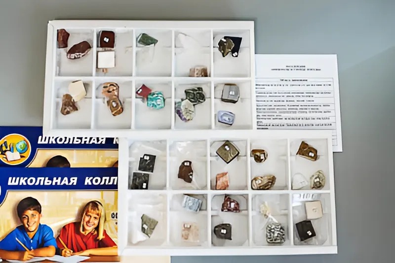 Коллекция предназначена для демонстрации на уроках неорганической химии и географии.