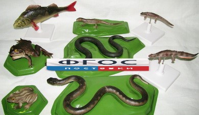В комплект входят муляжи следующих животных: - уж; - лягушка травяная; - жаба серая; - окунь; - гадюка обыкновенная; - тритон обыкновенный (самец и самка); - ящерица прыткая.