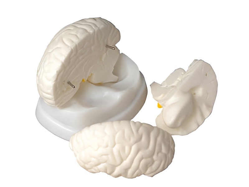 Модель изображает внешнее строение головного мозга человека и его сагиттальный разрез. На модели выделены желтым цветом нервные пучки.