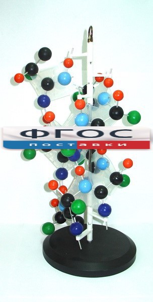 Модель представляет собой имитацию участка белковой молекулы, на котором можно рассмотреть структуру белка и взаимное расположение атомов в белковой молекуле. Модель позволяет рассмотреть первичную и вторичную структуры белка, химические связи между атомами в молекуле и между пептидами, из которых и собирается белок. Атомы разных химических элементов, из которых строится белковая молекула, обозначены на модели разным цветом и отличаются по размеру. Так, атом углерода обозначен шариком черного цвета, к нему присоединяется атом водорода оранжевого цвета, атом азота обозначается на модели шариком голубого цвета, а атом кислорода – синего. Участок пептида (аминокислоты) не принимающий участия в образовании химических связей в молекуле белка – радикал – обозначается на модели шариком зеленого цвета. Модель подвижно закреплена на металлическом штыре с подставкой. При объяснении материала учитель может перемещать цепочку полипептида вокруг оси, что позволит учащимся более детально разобраться в изучаемом вопросе. Высота модели не менее 47 см.