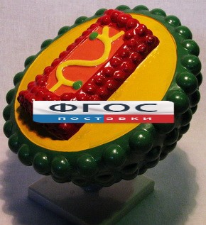 Возбудитель СПИДа – вирус иммунодефицита человека (ВИЧ) – относится к ретровирусам. Вирион имеет сферическую форму, диаметром 100-150мм. Наружная оболочка вируса состоит из мембраны, образованной из клеточной мембраны клетки-хозяина, закрепленной на каркасе из белковых молекул. В мембрану встроены рецепторные образования, по виду напоминающие грибы. Под наружной оболочкой располагается сердцевина вируса, которая имеет форму усеченного конуса и образована особыми белками. Внутри сердцевины располагаются две молекулы вирусной РНК, связанные с низкомолекулярными белками основного характера. Каждая молекула РНК содержит 9 генов ВИЧ и фермент – обратную транскриптазу, осуществляющую синтез вирусной ДНК с молекулы вирусной РНК. Высота модели не менее 26 см.